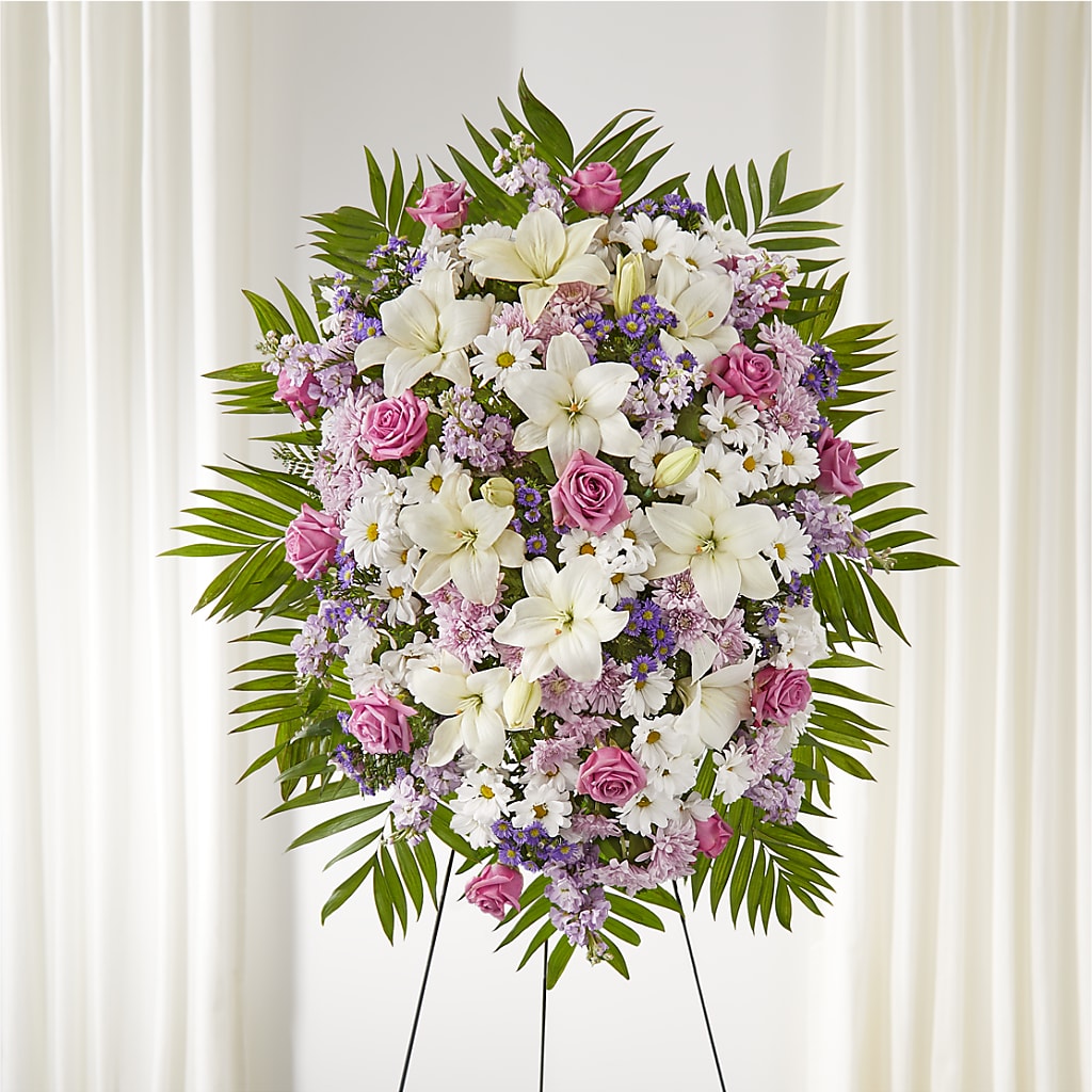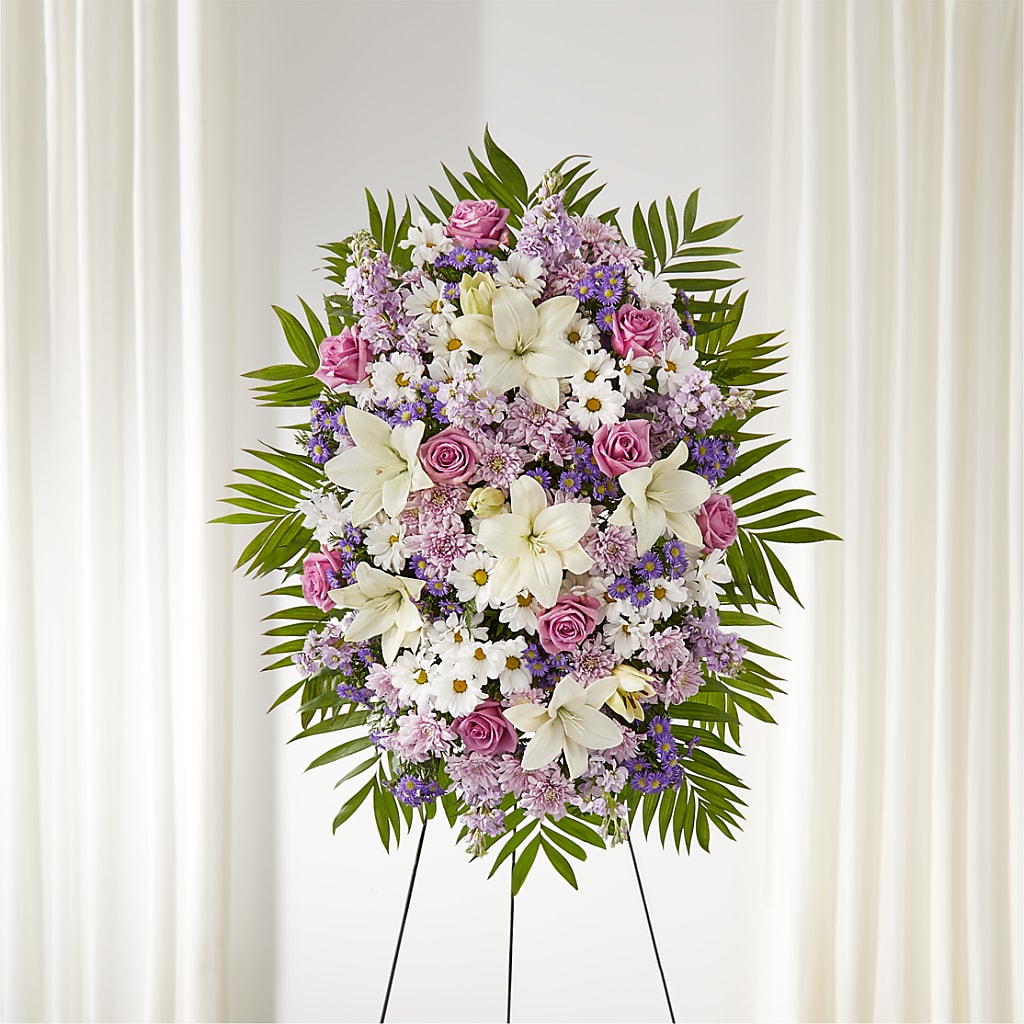 Wrap them in a beautiful hug during a time of need with a warm and inviting standing spray. This spray is artfully designed with white and lavender blooms, making a gorgeous accent to a loved one's service.